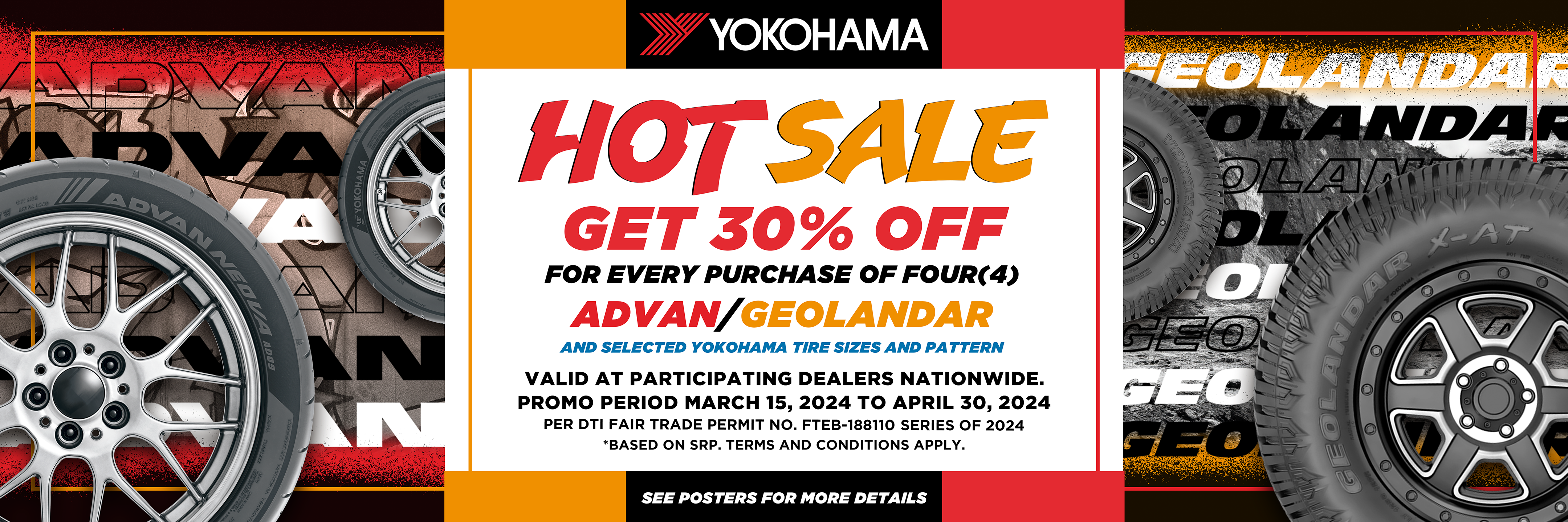 Get 30% off for every purchase of four(4) ADVAN/GEOLANDAR and selected Yokohama tire sizes and pattern.
